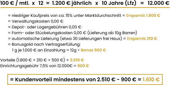 Bei Erreichung der Zielsparsumme erhalten Sie die Einrichtungsgebühr zurück, entweder in Geld oder Gold